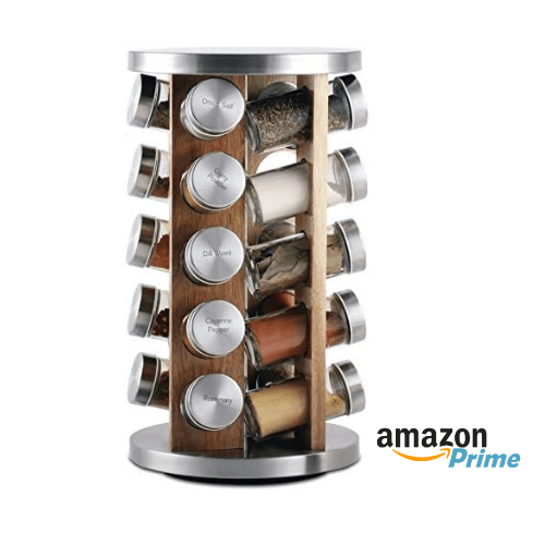 This spice rack is perfect for someone just starting off as it features 20 different spices which includes most common ones such as Basil, Turmeric, Red Pepper Flakes, Garlic Powder, Onion Powder and Paprika. I also love how the containers it come with are glass and the lids are stainless steel and pre-labelled which make them so useful as well as appealing